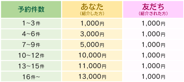 ※友だち(紹介された方)が電話説明会当日、案件パックの中から1件以上のご予約完了時点でボーナスの対象となります。