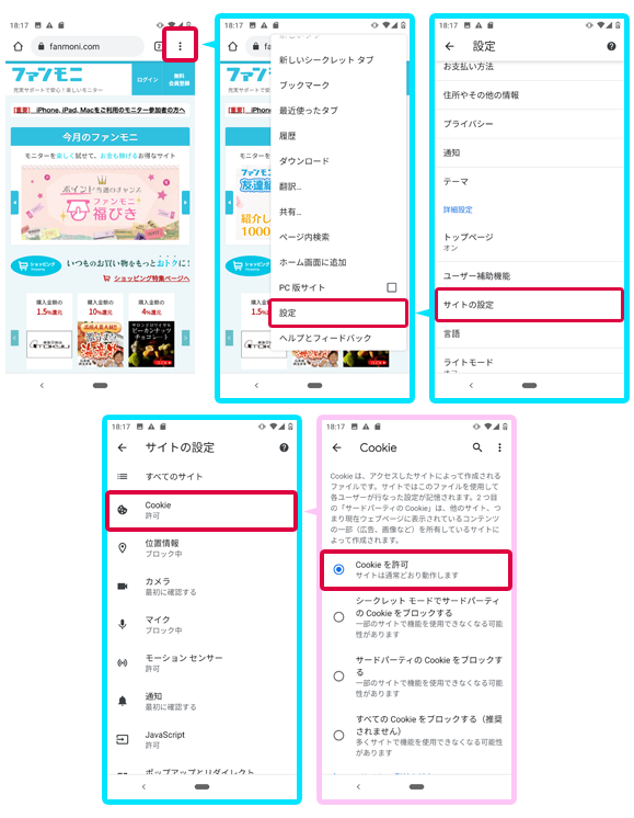 3. [設定] ⇒ [サイトの設定] ⇒ [Cookie]をクリックします。