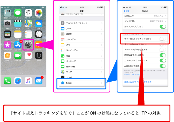 今回実施されましたiOSのアップデートに際しまして、インターネットを表示するブラウザ「Safari」に、ITP(Intelligent Tracking Prevention)が追加され、設定を変更しない状態ではモニターの参加を確認するための「Cookie」が自動的に拒否される仕様となっております。つきましては、対象のユーザー様は上記の手順に従いITPの設定の変更をお願いいたします。